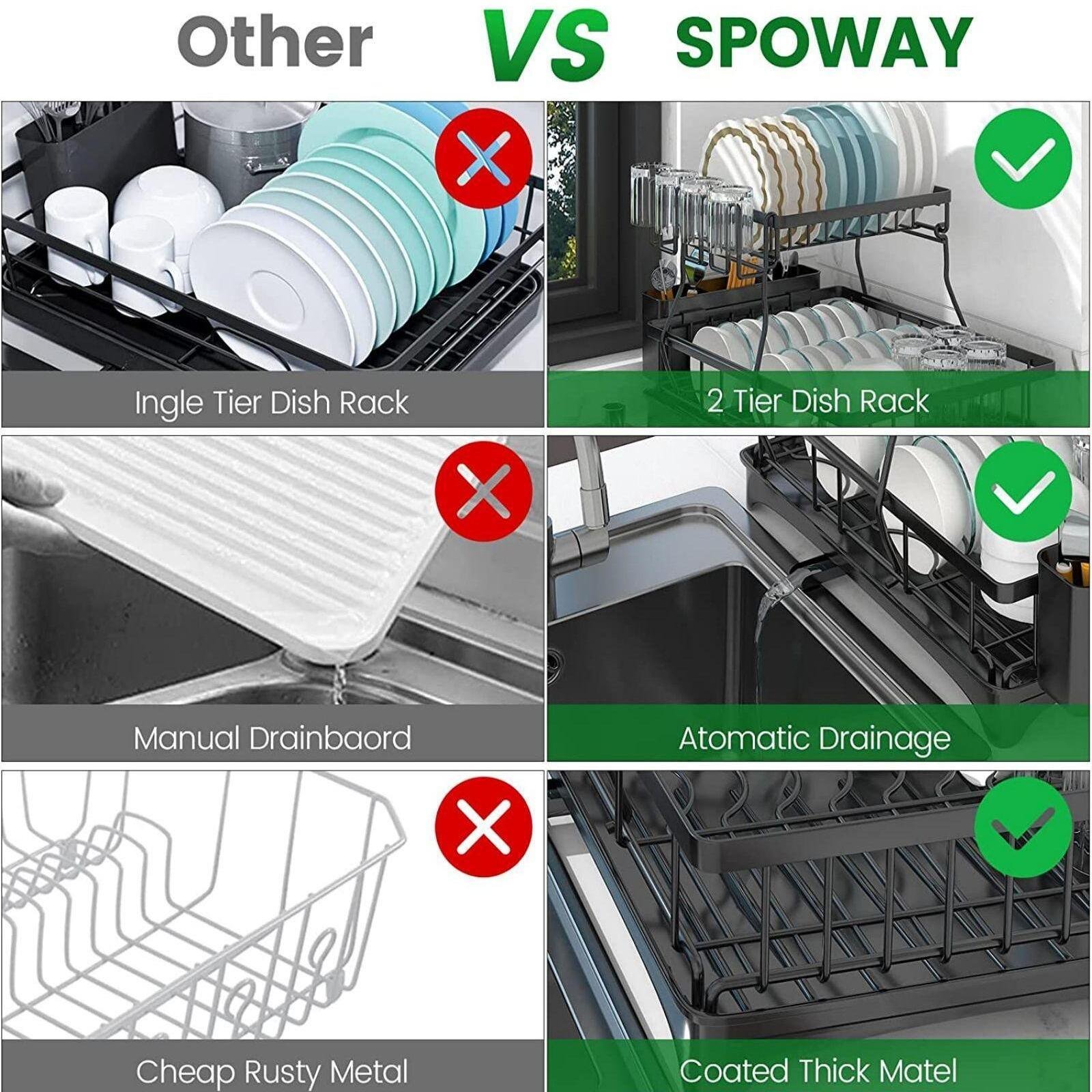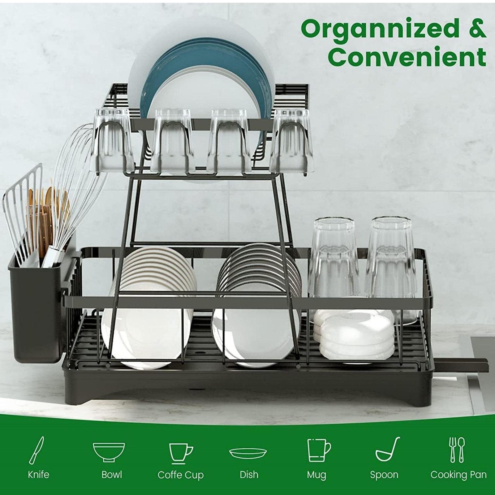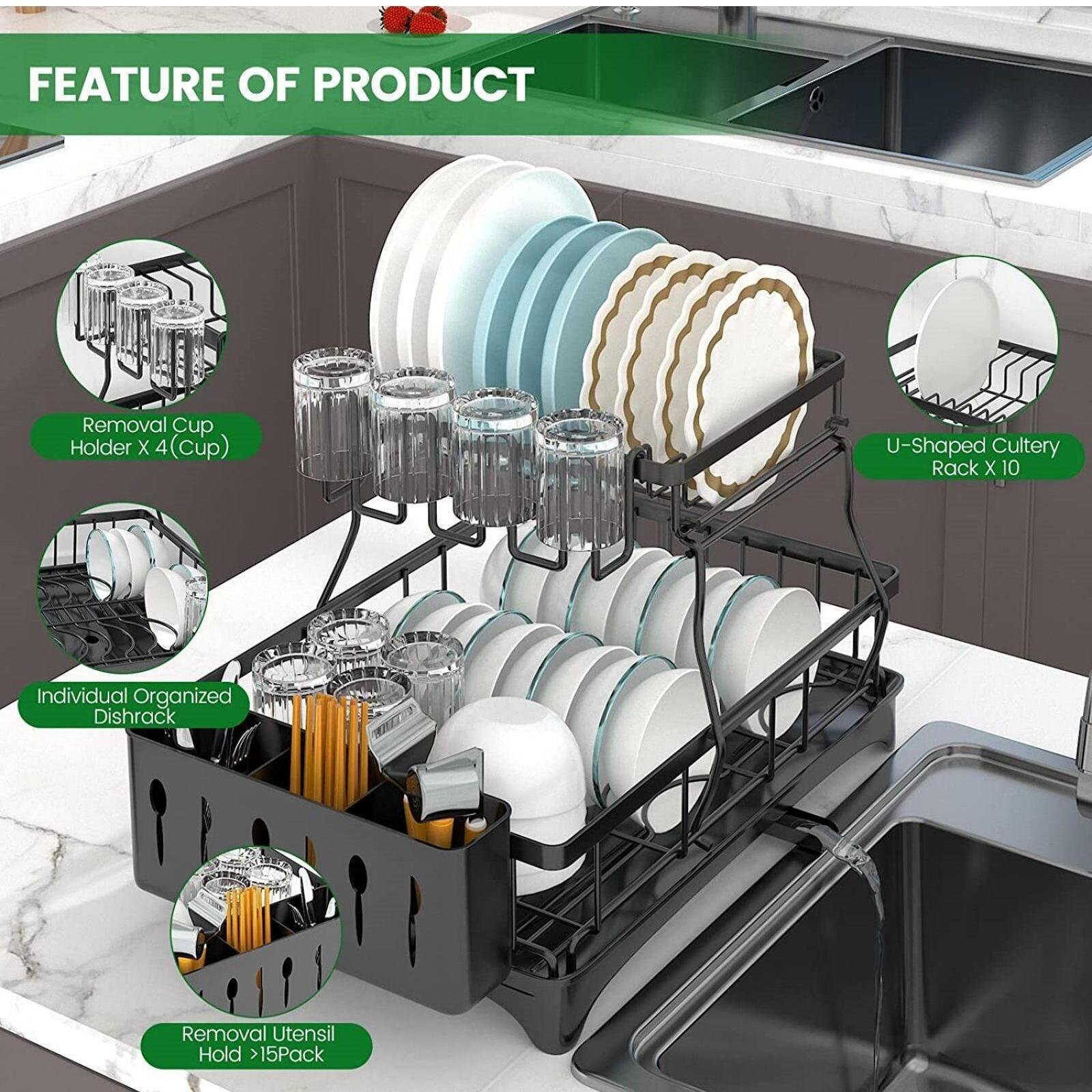 Premiun Material: This classic 2-tier dish drying rack is equipped with a utensil holder, cup holder, and dish drainboard, this dish rack will make your tableware neatly. Our 2 Tier Dish Drying Rack is made of heavy duty carbon steel. This paint process has an anti-scratch coating so it prevents glass and ceramic cups from being scratched. Corrosion and rust resistance is ideal for kitchen and food applications.
