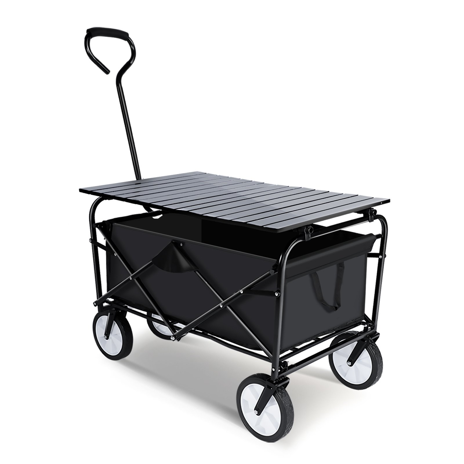 This Folding Camp Multipurpose Outdoor Wagon is perfect for hauling all your essentials around the campsite. Built with a durable steel frame and oxford fabric, it can handle up to 176 pounds. You can easily guide your load with an ergonomic handle that telescopes to where you need it. And when the job's done, the whole wagon and the desktop folds down to a compact size. It'll fit into your car trunk with plenty of room to spare.