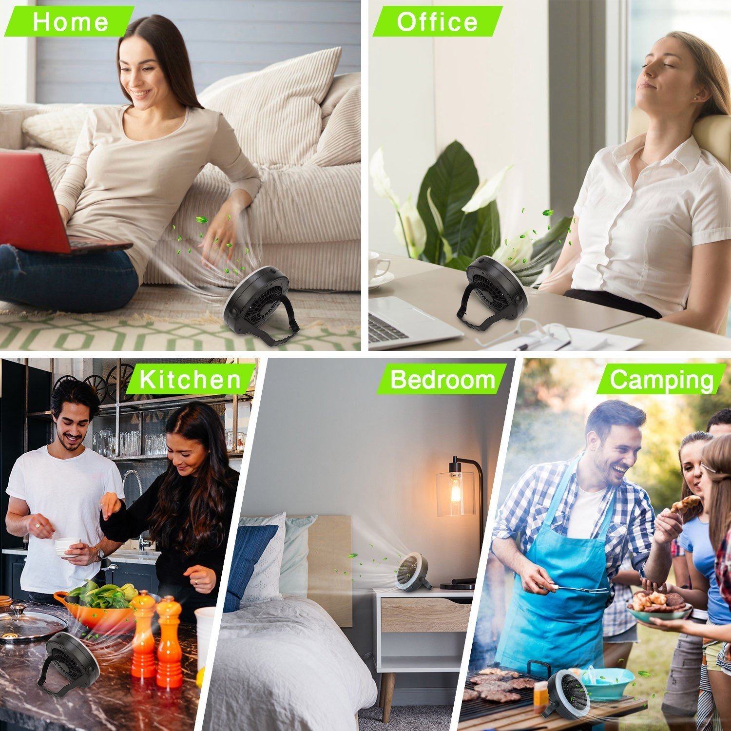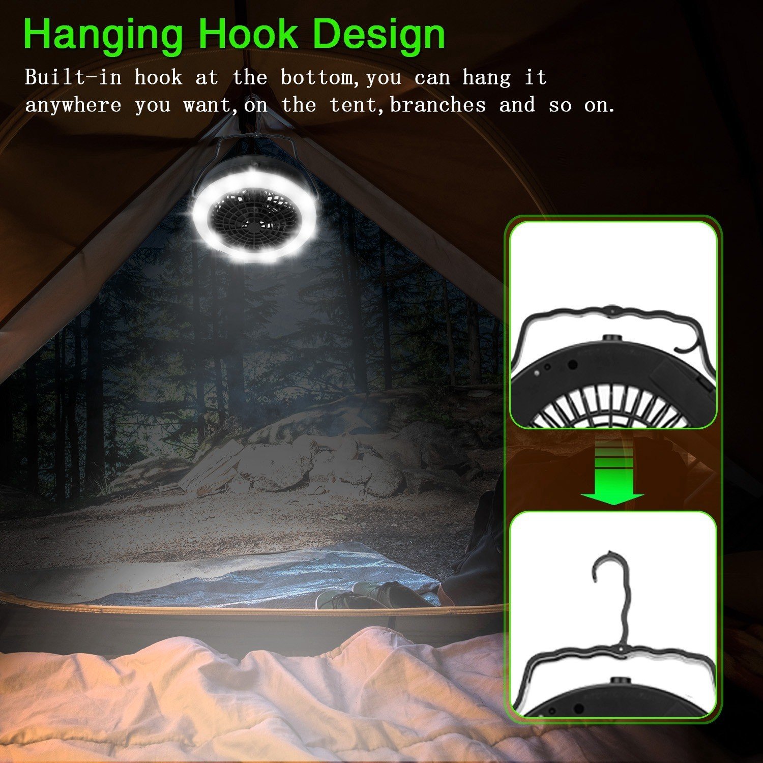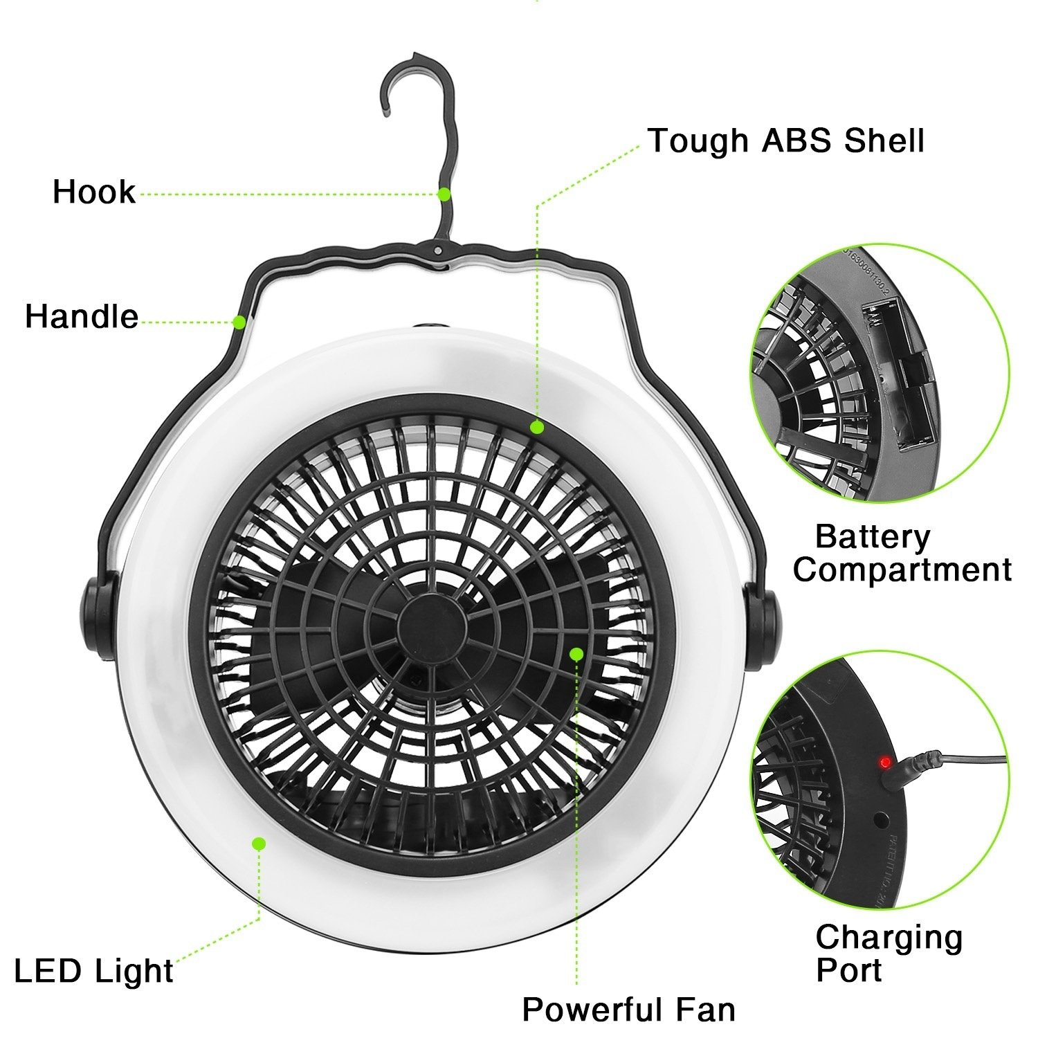 *[Camping Fan with LED Lights]- Combine tent fan and camping light functions. While bringing strong wind power; it can be quiet; energy-saving and stable for a long time. The head of this table fan is designed with a LED light for using in the tent at night. Wind power is adjustable horizontally/vertically by 360 degrees. Let you feel cool from every angle.