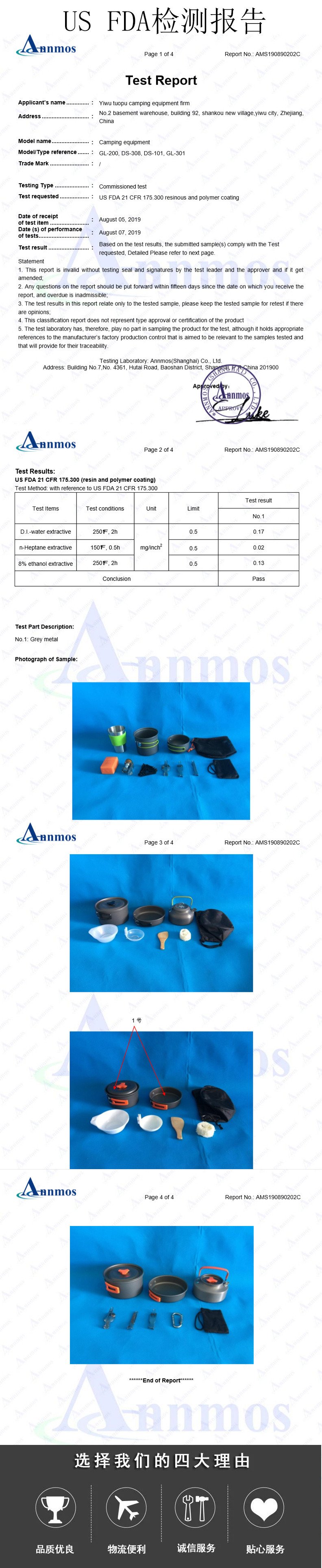 Suitable for 2-3 people, including a large pot, frying pan, a teapot, two stainless steel cups, a fork, a spoon, a dinner knife, a latch, the set of pots and pans using aluminum, after advanced hard treatment, high temperature resistance, abrasion. Knife, fork and spoon selected 410 stainless steel materials. Selected 304 stainless steel cups, special customization, can be placed near the teapot inside, easy to carry.