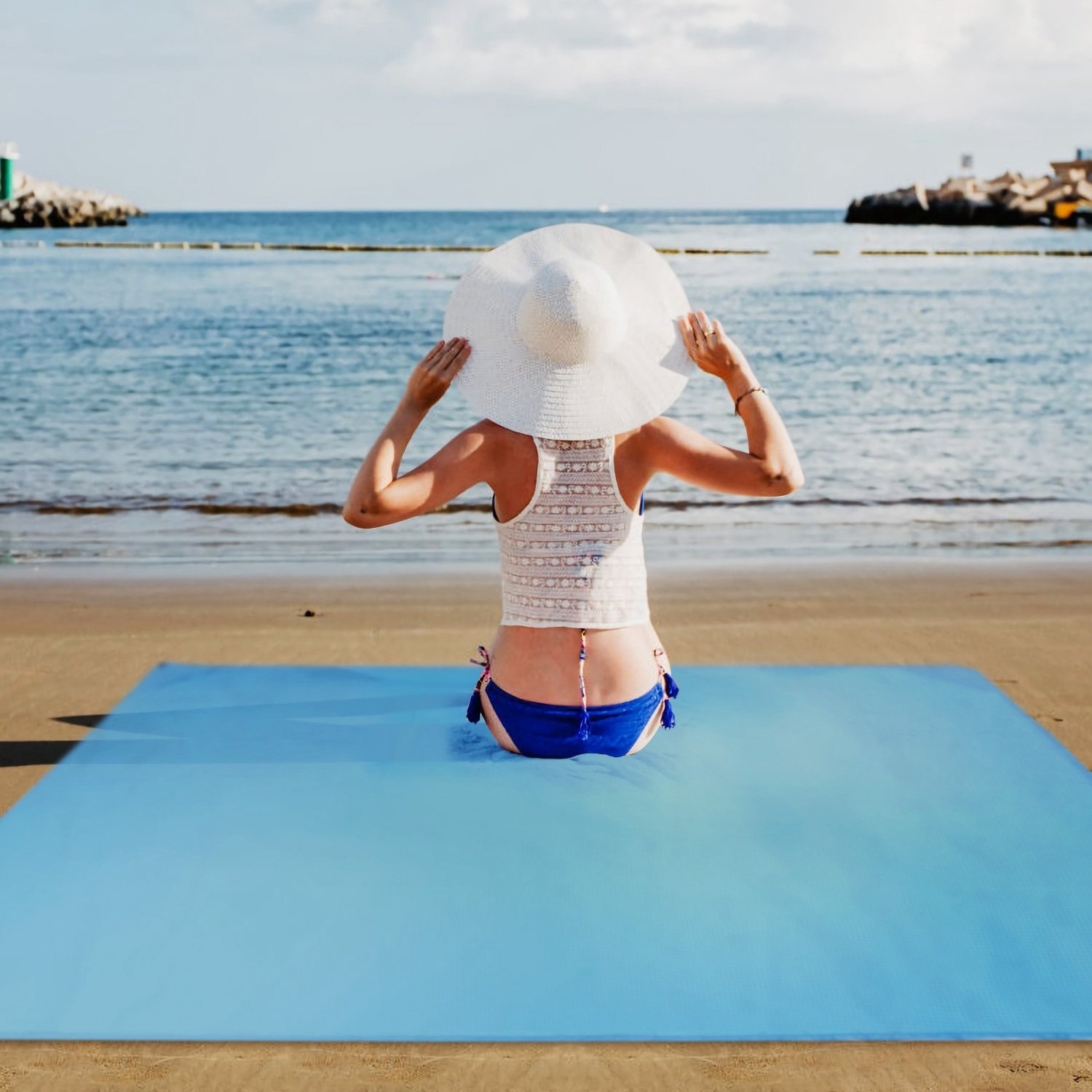 **DOUBLE WIND-RESISTANT DESIGN*: The beach blanket is with 4 incorporated pockets and 4 stake loops to provide dual windproof protection. You can fill it with sand into the pockets or fix it with four ground stakes to make sure the beach mat won't be blown by the wind and preventing it from being carried away.