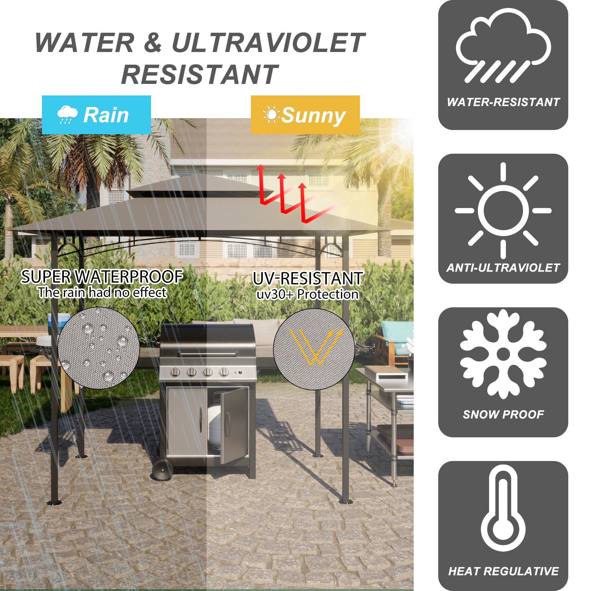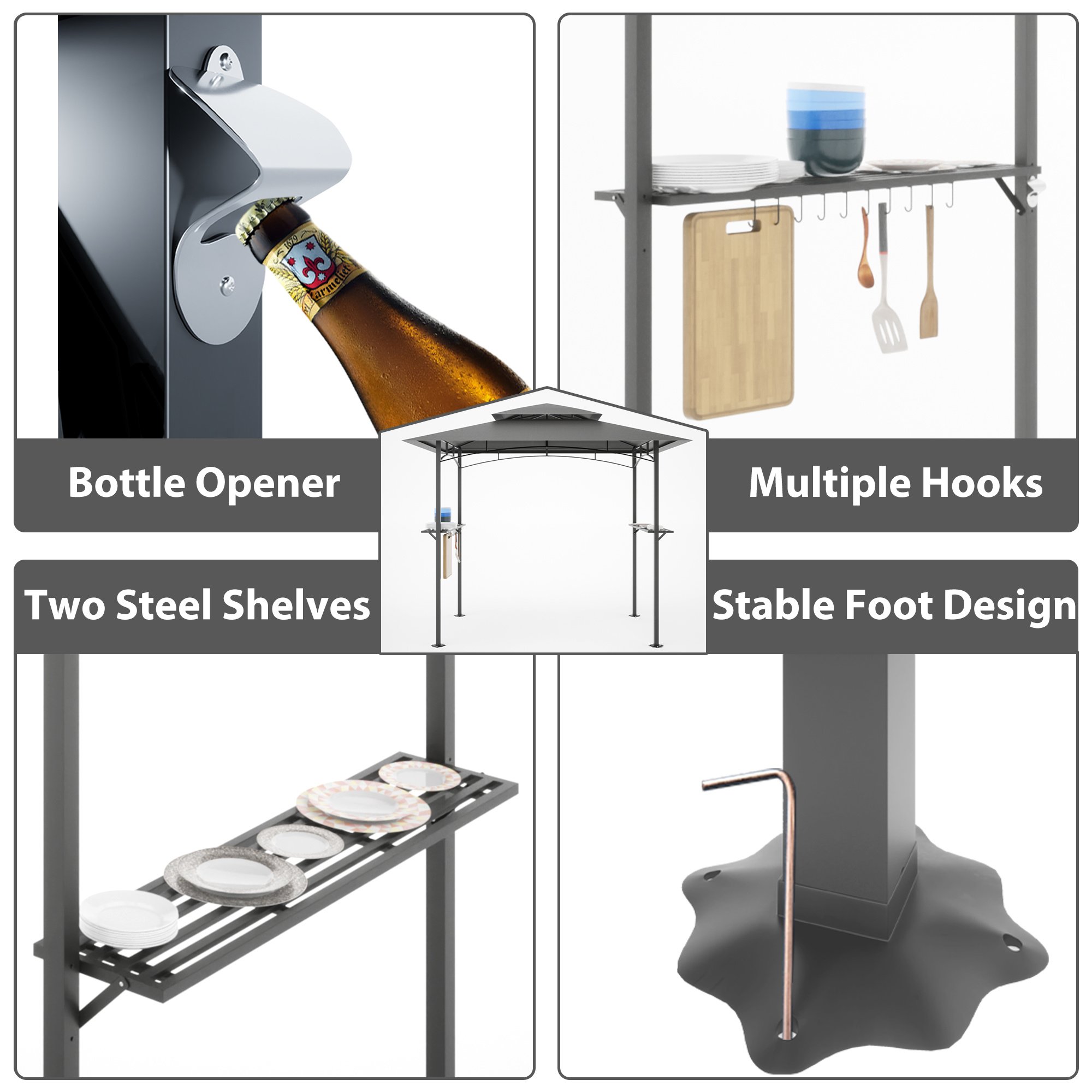 How about having a barbecue party with your friends on weekends? Two handy shelves for grill accessories, drinks, and food. The Grill Gazebo can offer you lots of shade and shelter in the hot sun and light rain. And the entire gazebo tent is big enough to accommodate around 3-4 people. Besides, the gazebo canopy used a high-grade powder-coated steel frame that resists water, rust, and corrosion. The gazebo tent fabric is used with durable UV protection polyester fabric, protecting you from the sun and light rain. Most importantly, our gazebo canopy is designed with a double-vented roof. The double top design makes the whole gazebo tent more beautiful, and also can make the BBQ gazebo more effective in wind resistance and UV resistance.